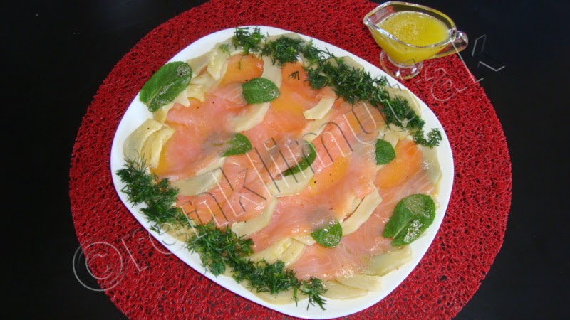 Tarifin orjinalinde somon fileto derisinden ayrilip, derin dondurucuda 4-5 saat bekletildikten sonra cikarilip incecik dilimlenerek kullanilmistir. Ben burada hazir satilan somon fumeden kullandim, hem de cig olmamis oldu. Carpacciodan da kisaca bahsedeyim.