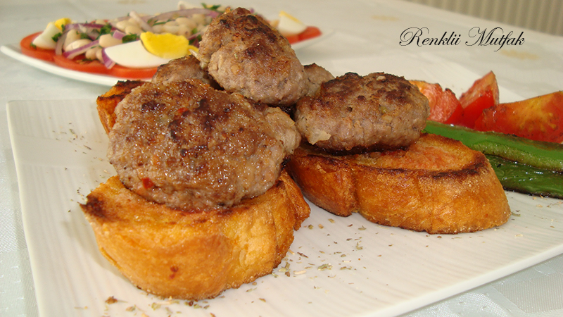 - Servis tabagina once kizarttiginiz ekmek dilimlerini uzerine de kofteleri dizin. Sivribiber ve domates dilimleri esliginde servise sunabilirsiniz.