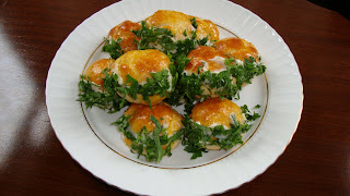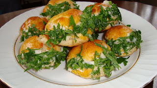 - Dinlenen poğaçaların karnını yararak, aralarına hazırlamış olduğunuz peynirli harçtan koyup ve ağız kısmına da sürerek ayrı tabakta olan maydanoza bulayın.