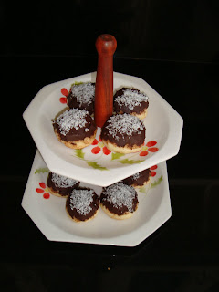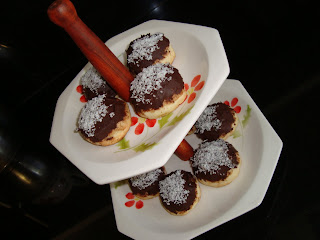- Pişen ve ılıyan kurabiyeler önce erimiş çikolataya ardından hindistan cevizine batırılır.