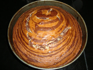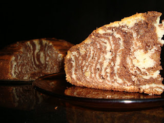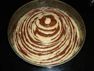 - 26 cm çapındaki kek kalıbını yağlayın. Kalıbın ortasına 2 yemek kaşığı beyaz hamur dökn. Kakaolu hamurdan da 2 yemek kaşığı alıp, beyaz hamurun tam ortasına dökün. İki ayrı renk hamur bitinceye kadar bu sıralama ile kalıba dökmeye devam edin.