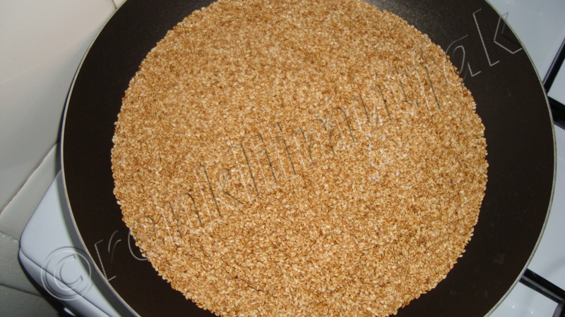 - Orta ateşte sürekli karıştırarak, en az yarım saat susamları kavuruyoruz. Yüksek ateşte yapilirsa susamların yarısı yanıyor, yarısı beyaz kalıyor, çok kızaranlar da mısır gibi patlıyor, daha da kotusu susamın yağı çıkıp yanık bir koku çıkıyor ortaya, işte bu sebeplerden dolayi sürekli karıştırmak gerekiyor.