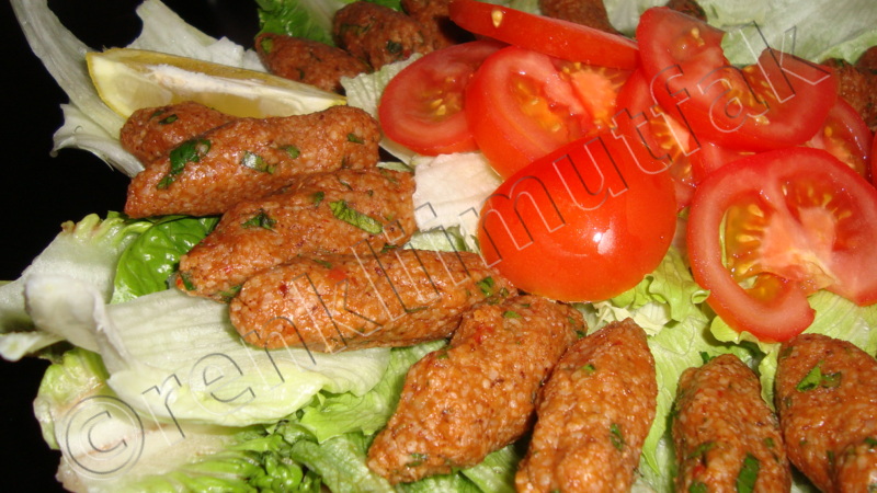 - Hamur kıvamına gelip bulgurlar iyice ezilince nar ekşisi, limon suyu ve zeytin yağı ilave ederek yoğurmaya devam edilir en son da ince kıyılmış maydonoz da eklenerek son kez karıştırılır ve ceviz büyüklüğünde parçalar alınıp parmaklarınızla sıkılarak şekil verilir.