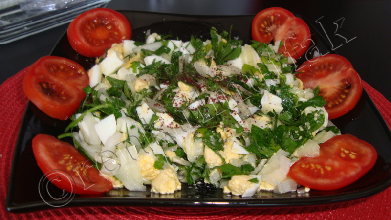 - Sogani kucuk ve ince sekilde dograyin. tuzlu suda birkac dk ovduktan sonra suzun yumurtalarin ustune ekleyin.