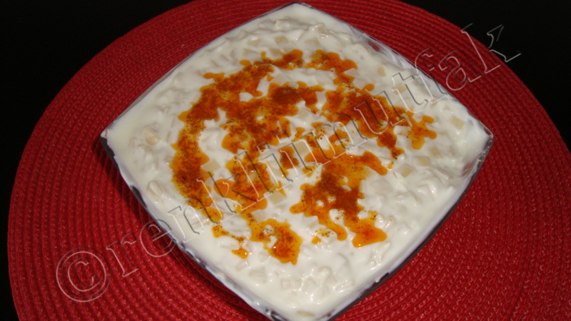 - Uzeri icin tereyagini eritip icine kirmizibiber ekleyin ve bu sosu yogurtlu karisimin uzerine gezdirin.