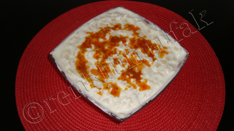 - Yogurdu bir kapta iyice cirparak icine dovulmus sarimsaklari ve tuzunu ilave edin. Haslanmis kesme hamuru yogurdun icerisine ekleyip karistirin.