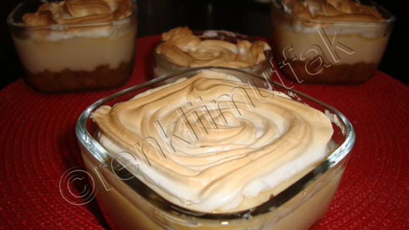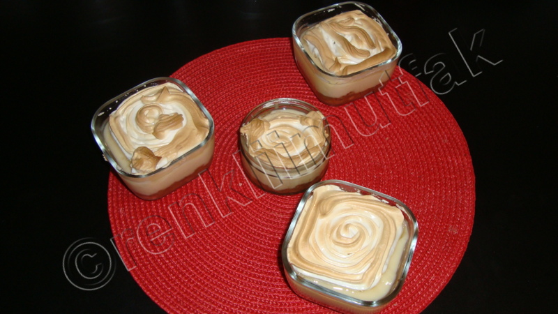 - Mereng icin, yumurta aklarını bir fiske tuz ilavesiyle çırparak kar haline gelene dek çırpın. Şekerini çırpmaya devam ederken bir kaç seferde ilave edin. 1-2 dakika daha çırpın ve isterseniz kaşıkla isterseniz krema sıkacağıyla şekiller vererek kremanın üzerine yayın.