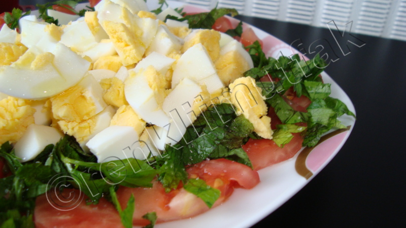 - En alta dilimlenmis domatesleri yerlestirin. uzerine ince dogranmis nane ve maydanozu ekleyin. En uste de kesmis oldugunuz yumurtalari koyduktan sonra yagini. limon suyunu. tuzunu da ekleyin.