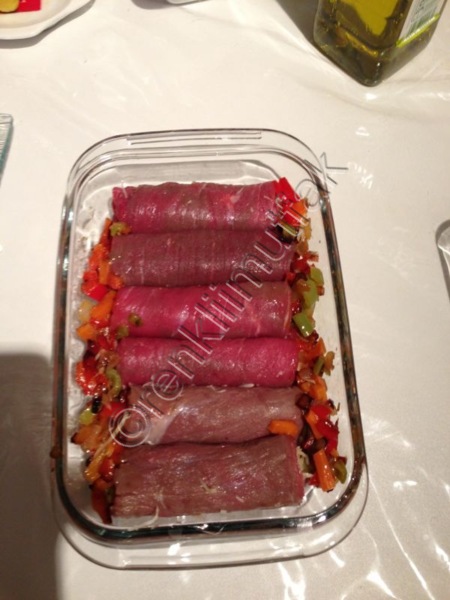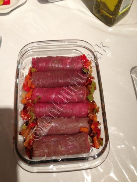 - Etleri uzunlamasina acarak, icine kavurdugunuz biberlerden bir miktar koyun. Onun uzerine de rendelenmis kasardan ilave edin ve etleri rulo yaparak sarin.