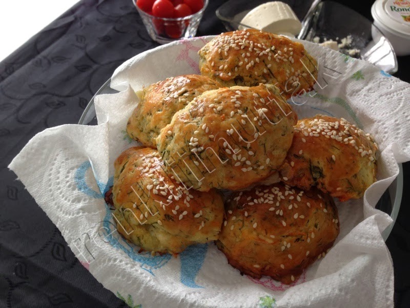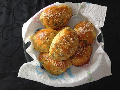 - Hamurumuz mayalanınca ufak parçalar alıp, elimizde açıp ortasına peynir harcından koyup kapatıyoruz. Tepsiye diziyoruz.