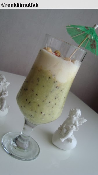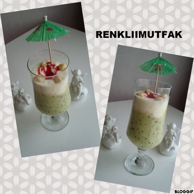 - Yogurdun yarisina kivi puresini ekleyin ve karistirin. Kuplarin yarisina kadar bu karisimi koyarak, uzerine yulaf ezmesi ilave edin ve tekrardan sade yogurtla tamamlayin.