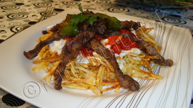 • Servis tabagina once kizarttiginiz patatesleri alin, uzerine sarimsakli yogurt dokun. Onun ustune de domates sostan ekleyerek kizarmis etleri istediginiz sekilde ilave edin.