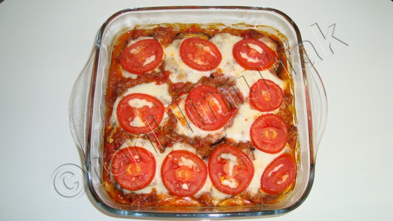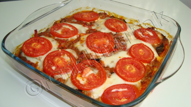 - Kizarmis patlican dilimlerini bir firin kabina bir sira patlican bir sira kiymali sos olmak uzere ust uste ekleyin.