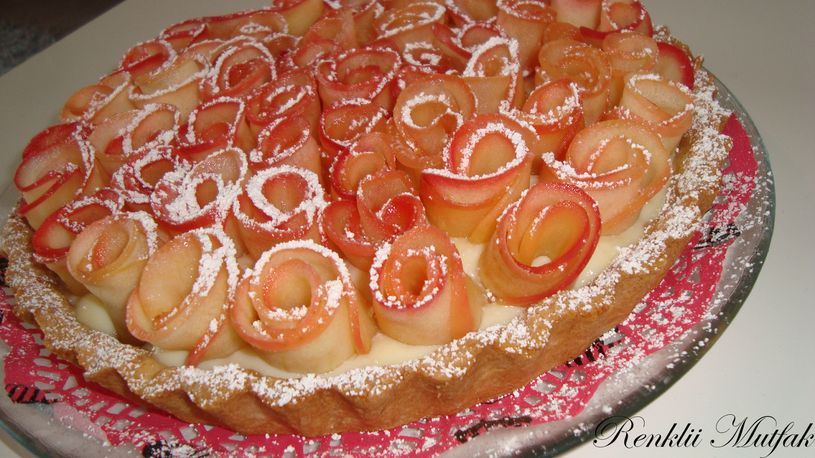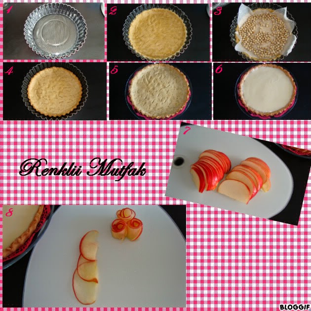 • Resimdeki gibi uc elma dilimini ust uste koyarak rulo yapin ve gul sekli verin. Hazirladiginiz elma gulleri turtanin uzerine dilediginiz gibi dizin.