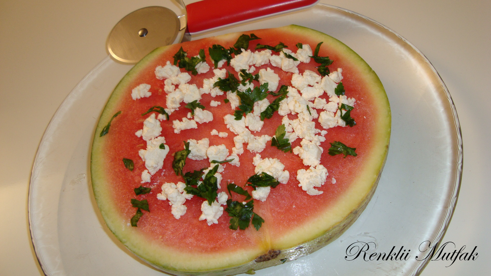 Yazin hepimizin vazgecilmez lezzeti olan, karpuz - beyaz peynir ikilisini birde boyle deneyin :) Yaninda tuzlu krakerlerle de bir ogun olusturabilirsiniz.