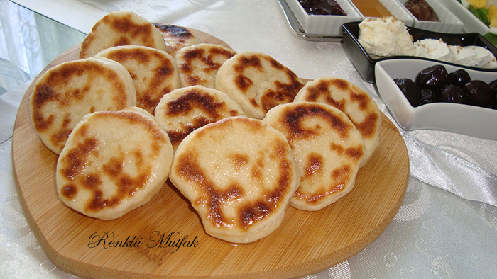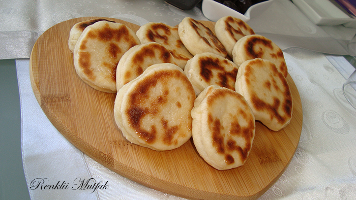 - Hazirlanan hamuru tezgaha alip unlu zeminde merdane yardimi ile 1 cm kalinliginda acin. Su bardagi veya herhangi bir kalip ile keserek yagsiz isitilmis tavada arkali onlu pisirin.