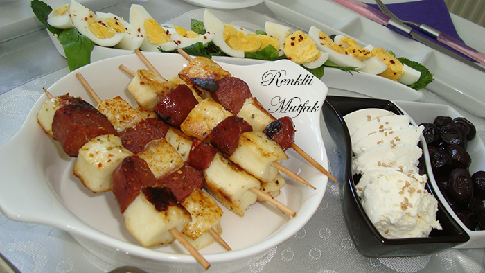 SilEllerinize sağlık her şey çok güzel görünüyor.Peynirli sucuklu şişler dikkatimi çekti.Acaba hellim peyniri mi kullandınız ve tavada mi pişirdiniz diye merak ettim <: